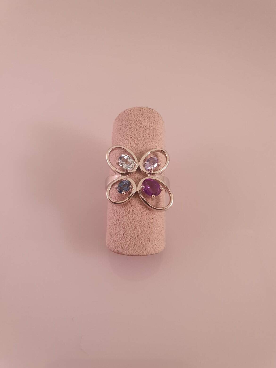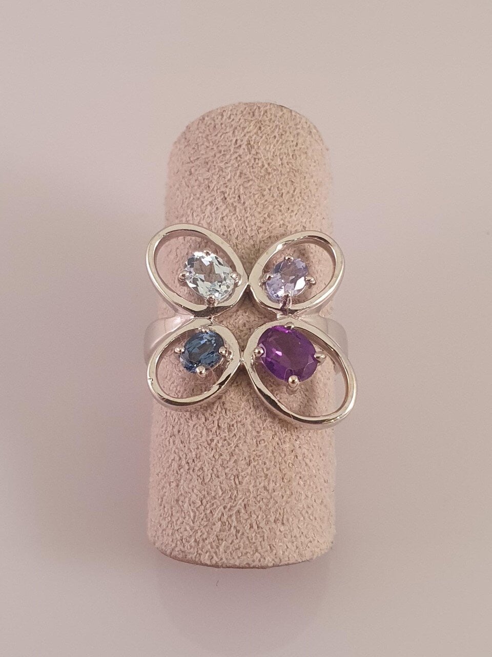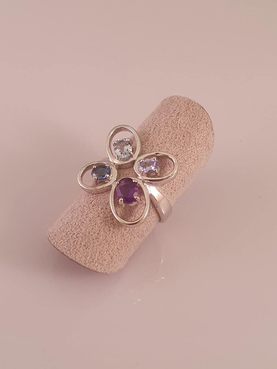 14 kt hvidguldring med 2 topas, 1 Aquamarin, 1 amatyst.