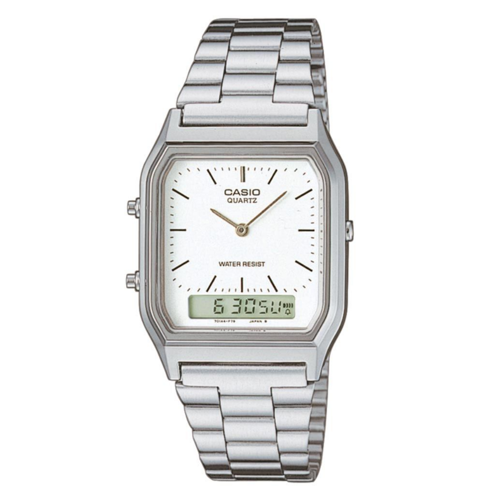 Et ur i stål med hvid skive og er med analog og digital visning. Uret har også datovisning, stopur og alarm.