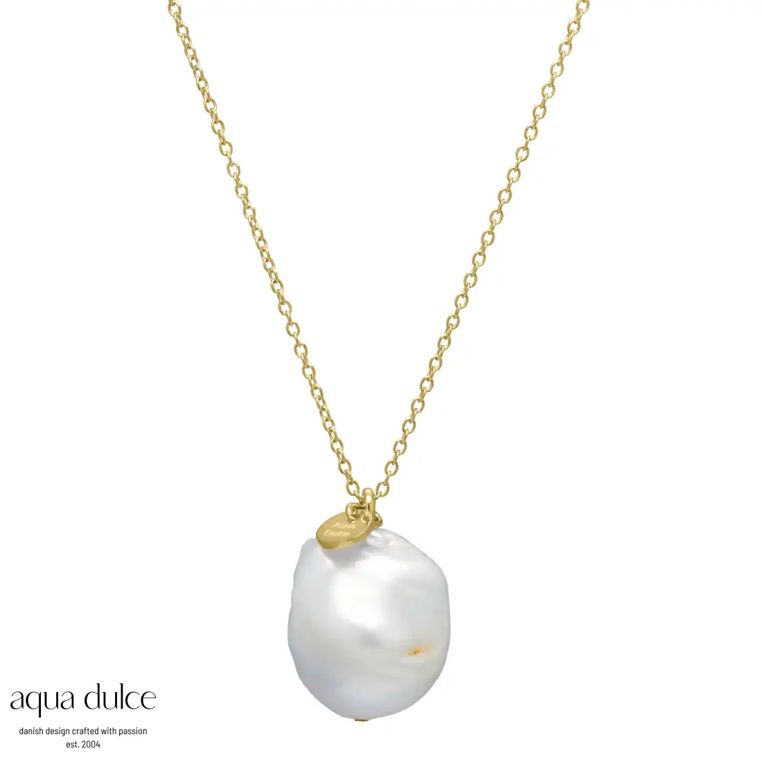 Aqua Dulce BAROK sølvforgyldt halskæde med en 19 mm. hvid, Barok ferskvandsperle. Længden er 60 cm.