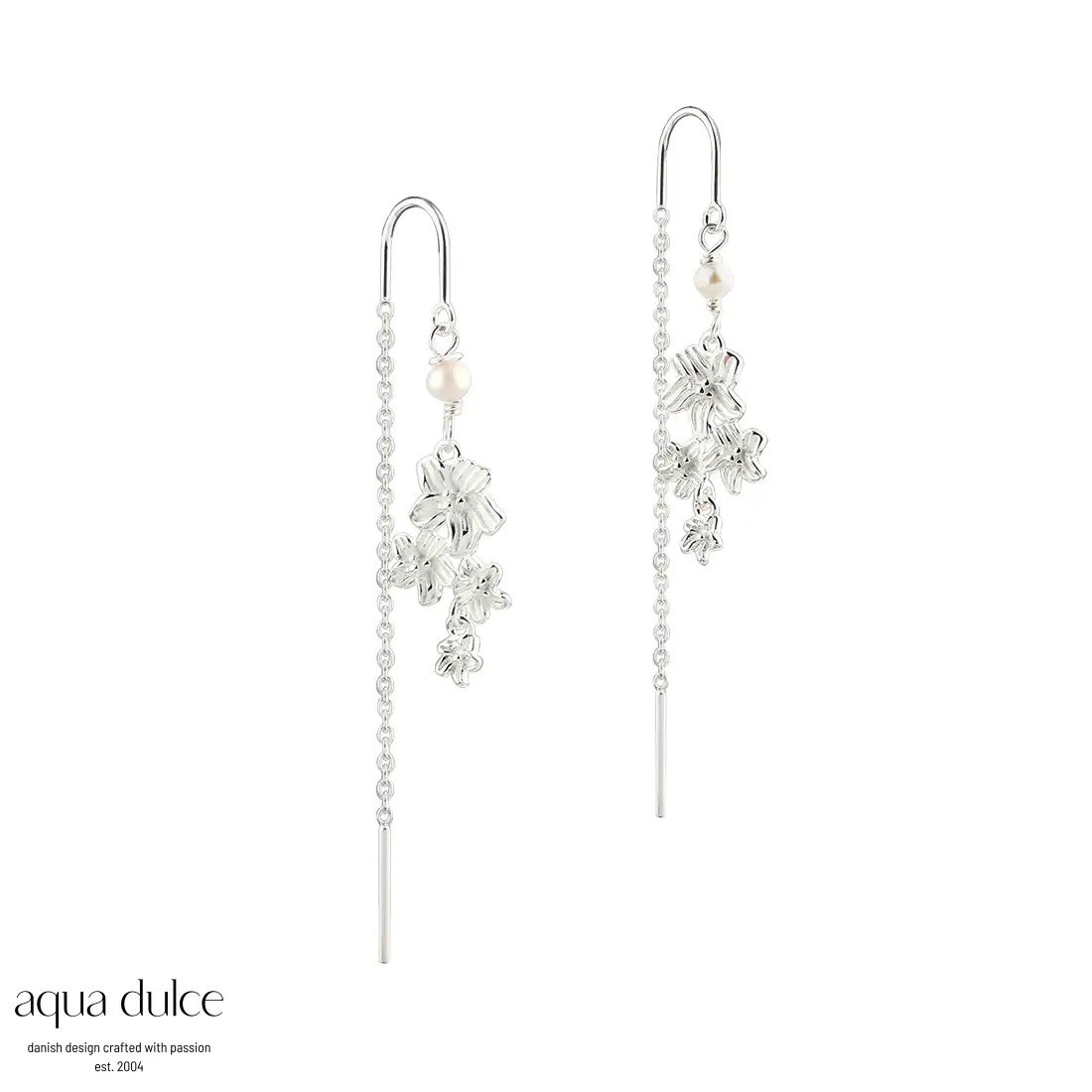 Aqua Dulce JASMIN sølv øretråde med fine blomster og ferskvandsperler.
