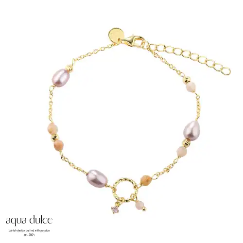 Aqua Dulce KOI ROSE PEARL armbånd i forgyldt sølv med rosa ferskvandsperler, rosa zirkonia & sunstone. Længde er 17 cm med forlænger på 3 cm.