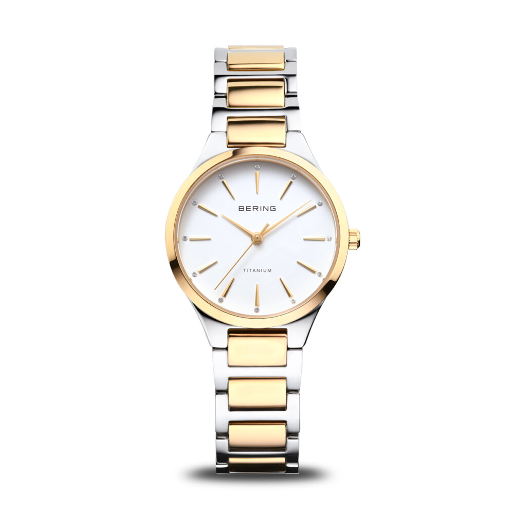 Et flot kvarts ur i bicolour titanium, safirglas og swarovski-detaljer. Uret har en vandtæthed på 100m.