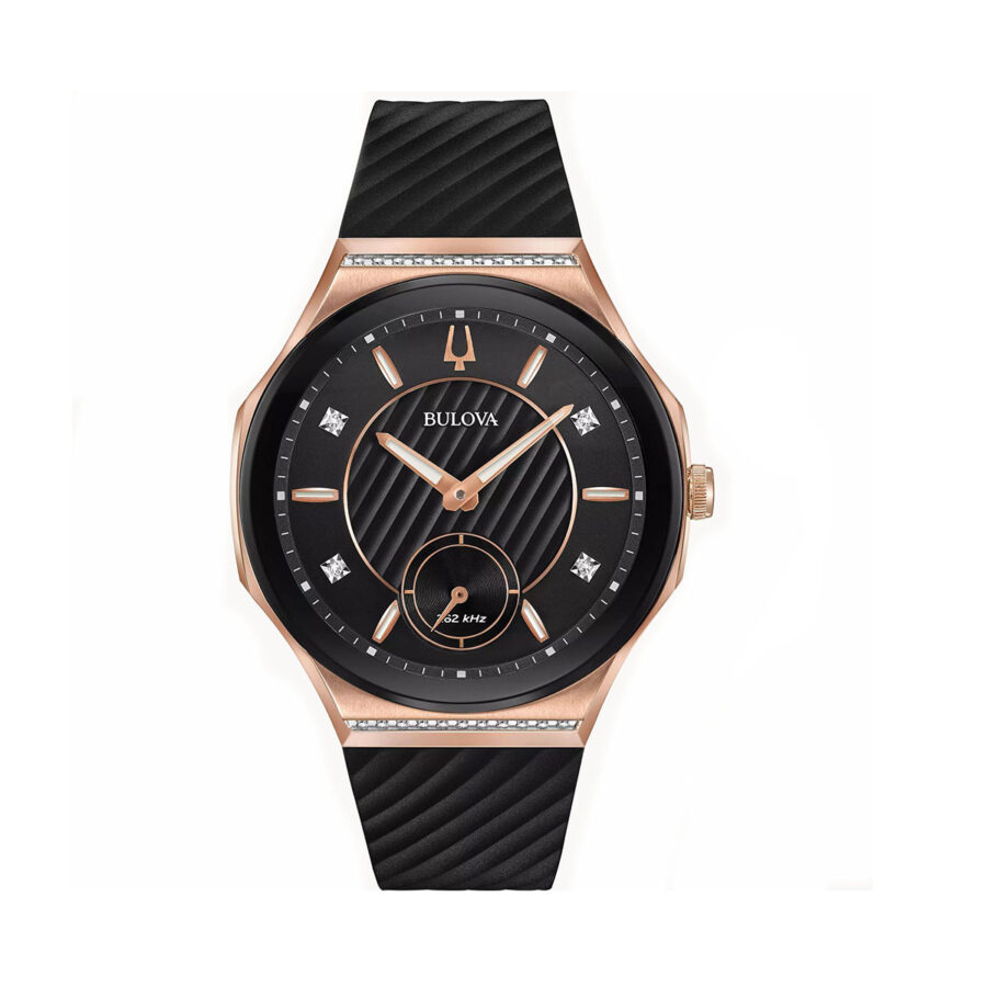 Bulova Curv 98R239 er et elegant dameur med sort urskive og rose gold-tonede detaljer, udsmykket med 26 diamanter
