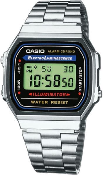 Casio Retro A168WA-1YES. Digital ur, med dag og datovisning. Lys i display. Urkassens størrelse er på 36mm.