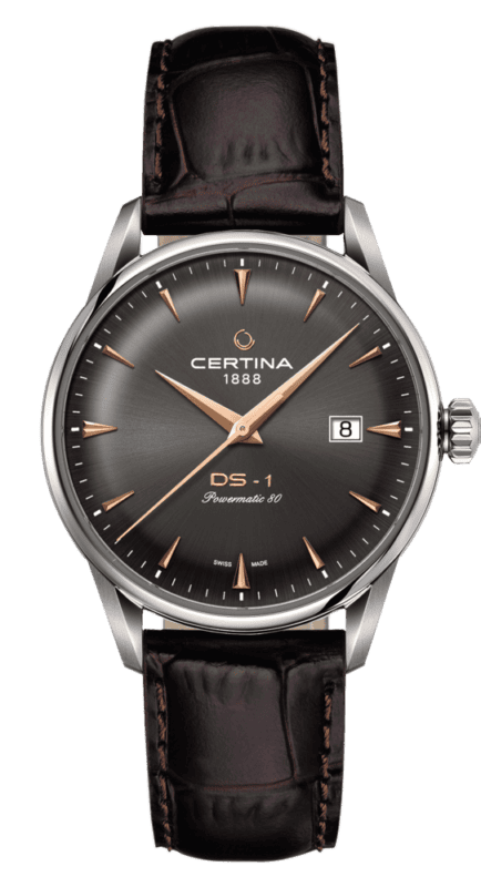 Certina DS-1 powermatic80 herre ur, med flot læderrem , grå skive og rosagyldne index samt visere. Uret har dato og safirglas. Det er vandtæt til 10 ATM. Der medfølger 2 års garanti på urværket.