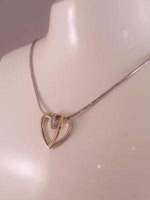 14 kt guld og hvidgulds hjertevedhæng med diamanter, 0,05 W.Si. samt 45 cm sølvkæde.