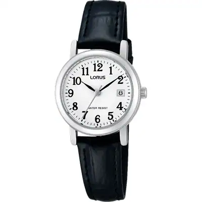 Lorus RH765AX-5 er et flot simpel dame ur med hvid skive og sort læderrem. Uret tåler regnvand og til du vasker hænder. Uret er med dato og urkassen måler 26 mm.