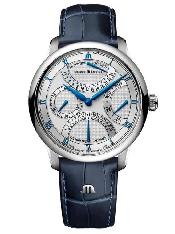 Maurice Lacroix Masterpiece tripple rétrograde automatik ur med sølv urskive, måler 43 mm. Uret er med safirglas med dobbelt anti-reflekterende belægning og læderrem. Uret har en strømreserve på 38 timer.