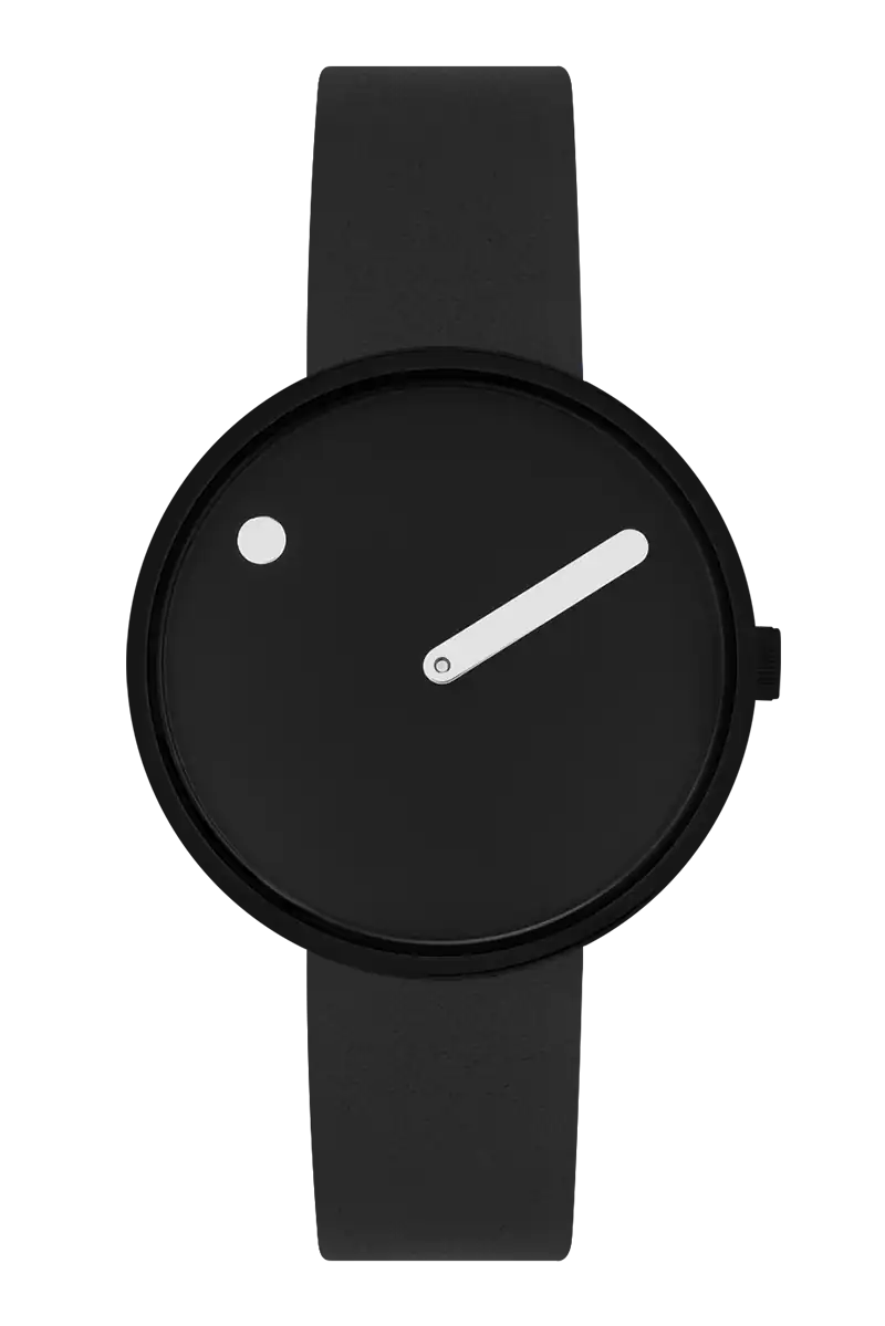 Picto 34061-0114B med en 34mm sort urkasse med hvide visere og en sort silikonerem.