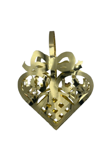 Den store størrelse og det dekorative design gør julehjertet til et imponerende og elegant element på juletræet eller som en selvstændig dekoration i hjemmet. Den forgyldte overflade reflekterer lys smukt og skaber en varm og festlig julestemning.