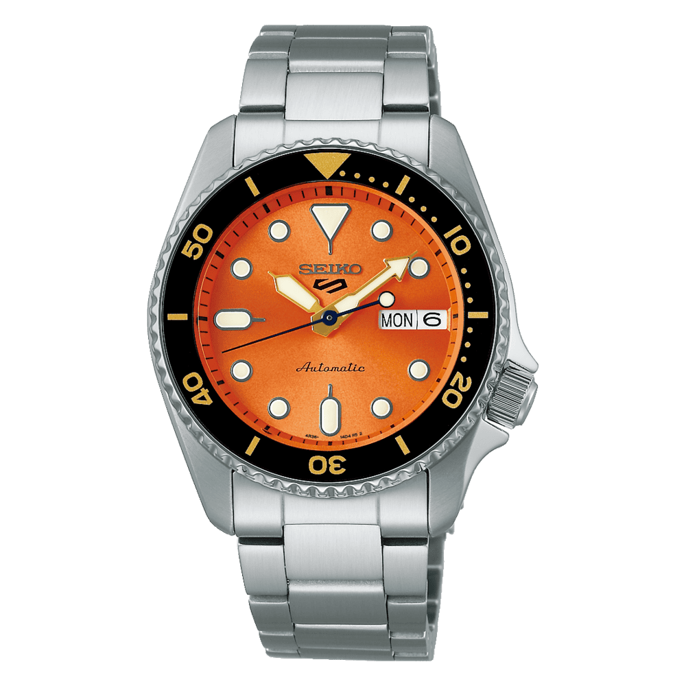 Et sporty automatisk ur med orange skive med dag og dato, uret har en gangreserve på ca. 41 timer. Uret har en vandtæthed ned til 100m.