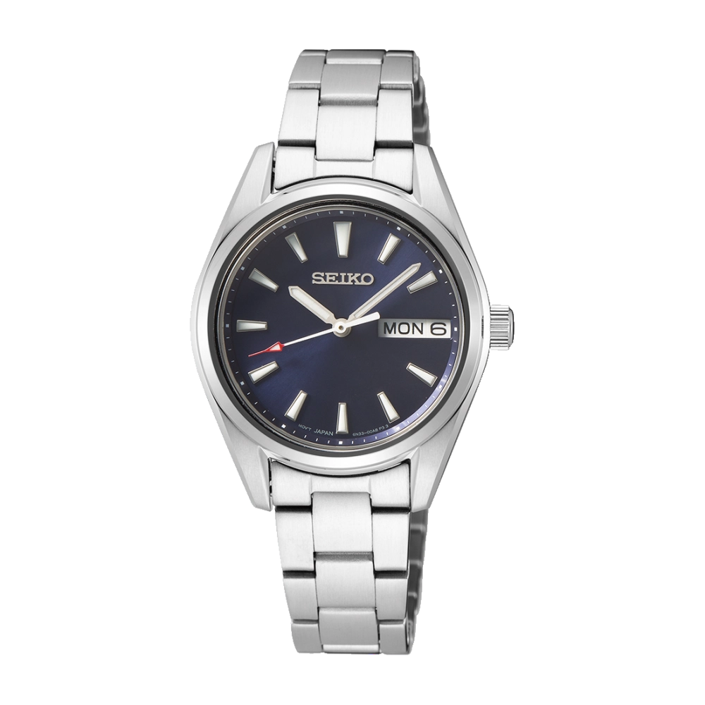 Et fint dameur med rustfri stållænke med mørkeblå skive og med safirglas. Uret har en vandtæthed ned til 100 meter.