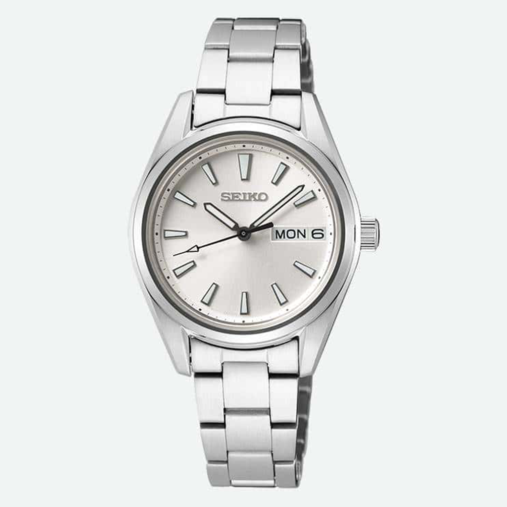 Et flot dameur med rustfri stållænke og hvid skive. Uret er med safirglas og har en vandtæthed ned til 100 meter.