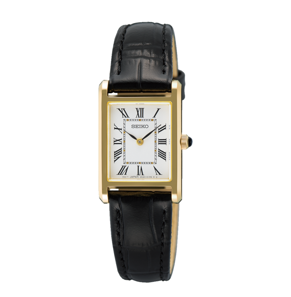 Seiko Classic SWR108P1 – Et flot firkantet dameur med sort læderrem, stål gulddoublé, sorte visere og safirglas.
