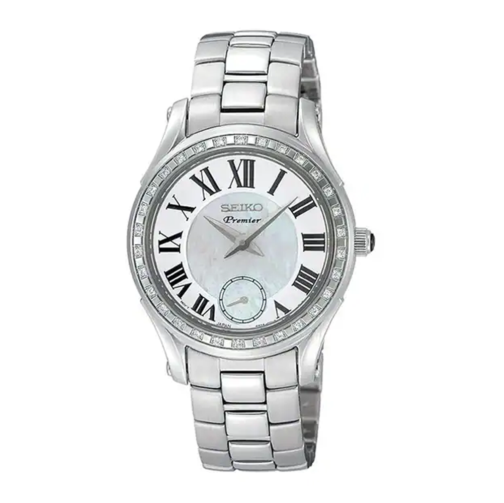 Et smukt dameur med stål lænke, en flot perlemor skive med sorte romer tal og safirglas. Uret har 30 diamaner i urkransen.