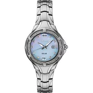 Seiko Solar SUT371P9 – Et flot dameur med rustfri stållænke og perlemorskive med 10 diamanter samt diamanter i kransen. Der er i alt 28 diamanter.