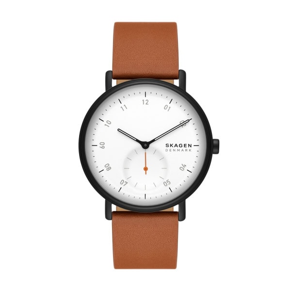 Skagen SKW6889 dameur med lysebrun lædderrem og kasse i rustfrit stål med sort belægning.